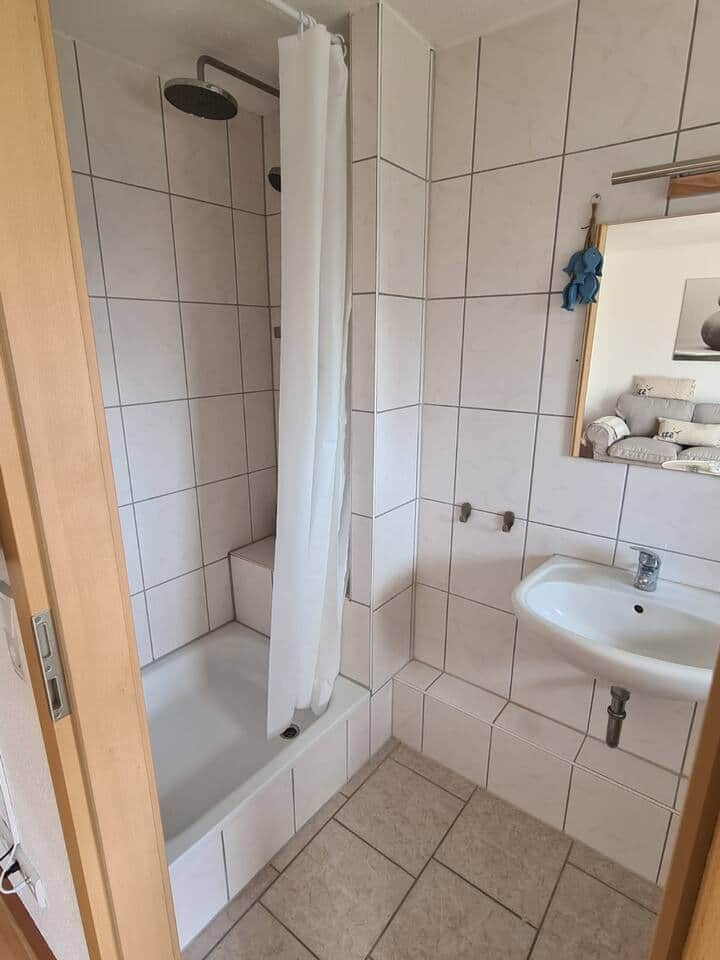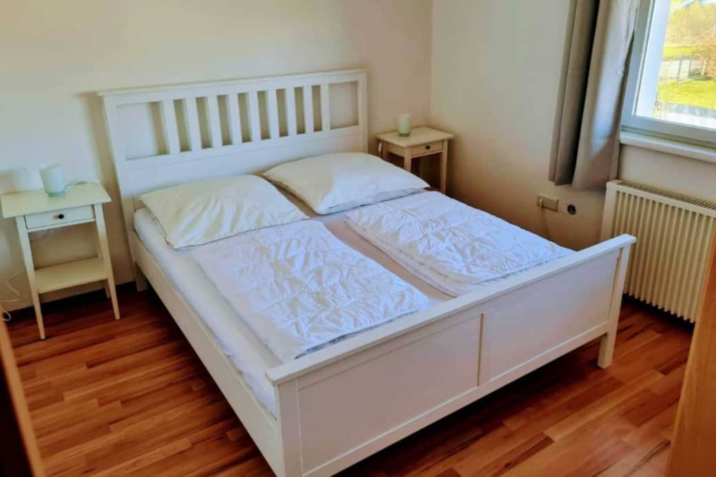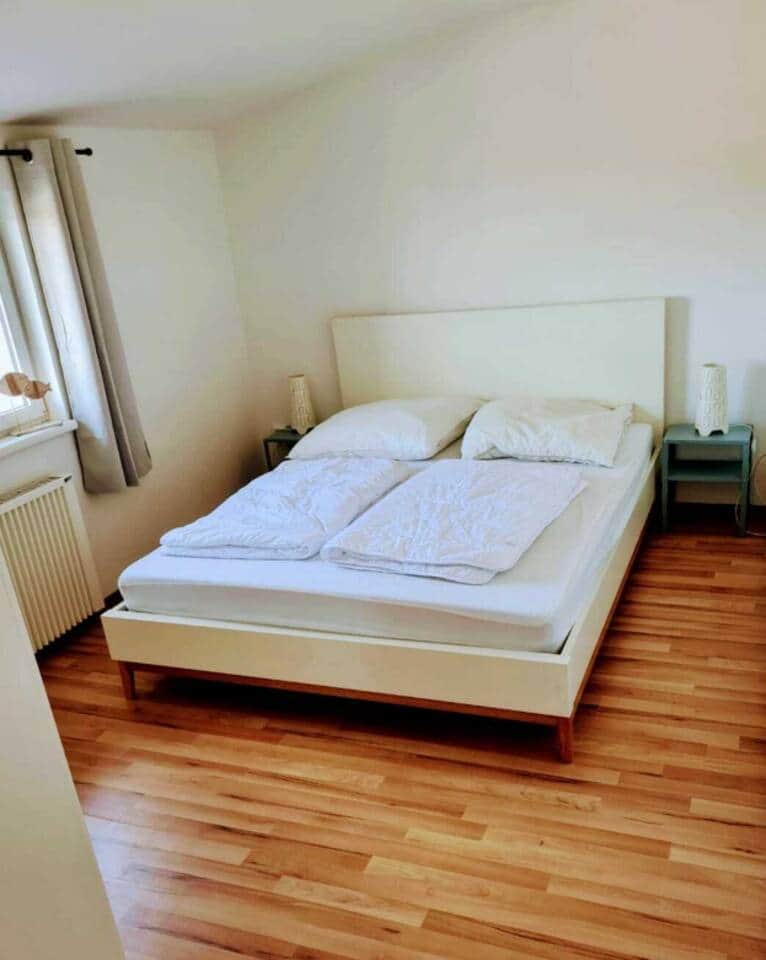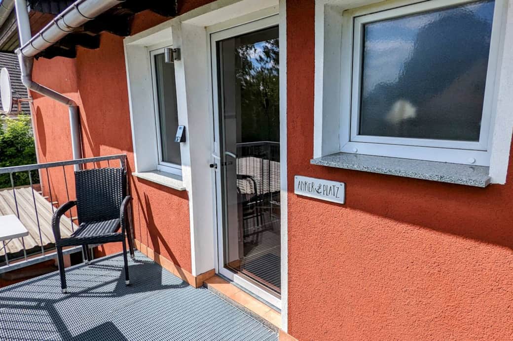 The holiday apartment "Ankerplatz" is located on the first floor and offers a view of the large garden, which can be used by all guests. The apartment consists of two bedrooms, a bathroom with a shower, and a living kitchen. Each bedroom has a large double bed (160*200cm), which can also be supplemented with a baby travel cot. The kitchen is equipped with a double hotplate, a grill microwave, a refrigerator, and a dishwasher. Pots, pans, and dishes are, of course, also available.